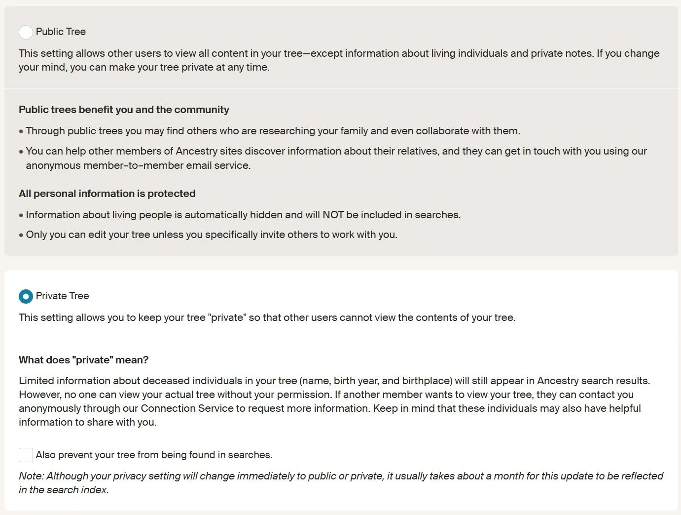 If you prefer to keep a tree private while still benefiting from Ancestry’s DNA tools, consider leaving the “prevent your tree from being found in searches” option unchecked. This allows limited indexing while preserving control over who can view the full tree.