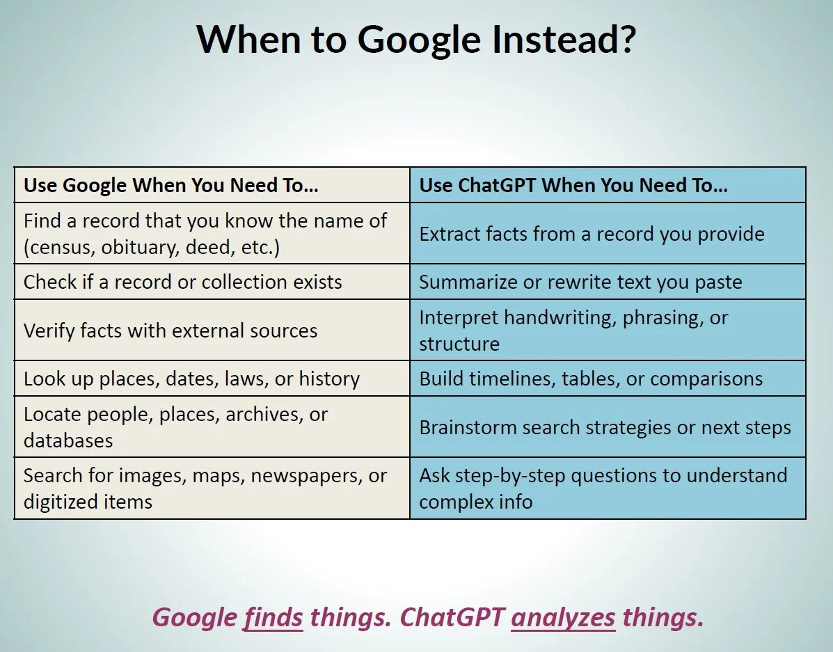 If your goal is to find a record, check if something exists, or search for a person, use a search engine or go directly to the genealogy database. If your goal is to understand a record, organize your research, or figure out what to do next, that is where AI helps.