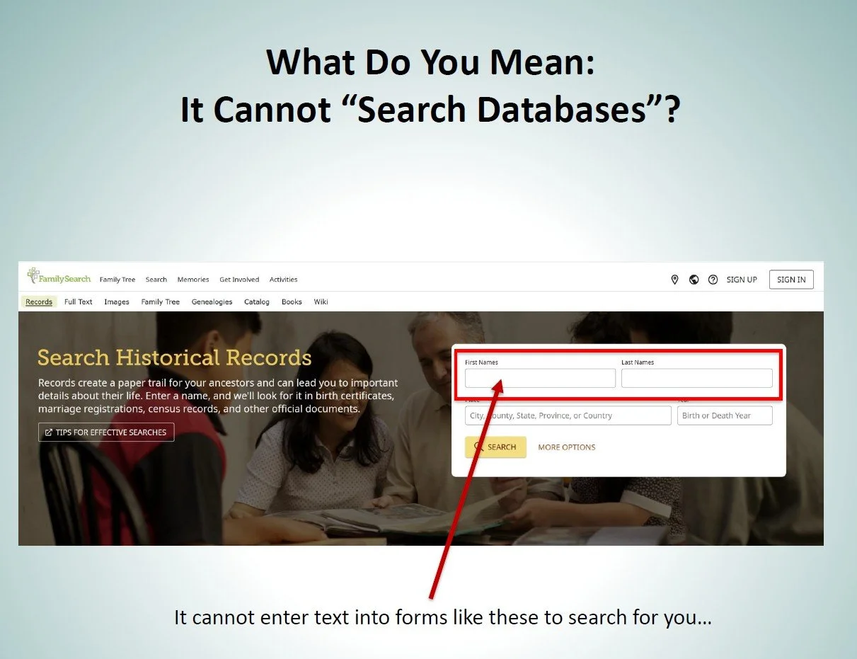 That would be convenient. That is not what they do. AI chatbots do not interact with websites like a person. They are not clicking into search fields, submitting forms, or pulling results out of genealogy databases in normal use.